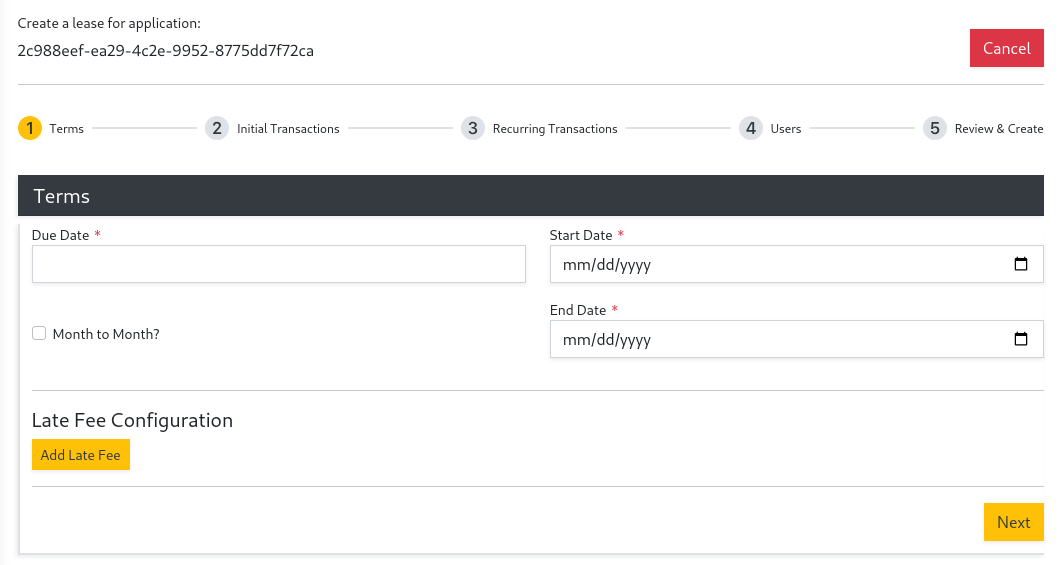 Start Date,Due Date, andEnd Date, or checkMonth to Monthif there is no End Date. You can also add the automatic late fee configuration on this page. Then clickNext.