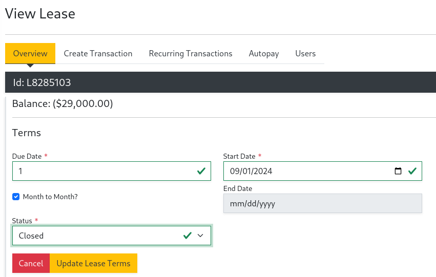 Statusdrop down on the lease from Active to Closed. Then selectUpdate Lease Terms