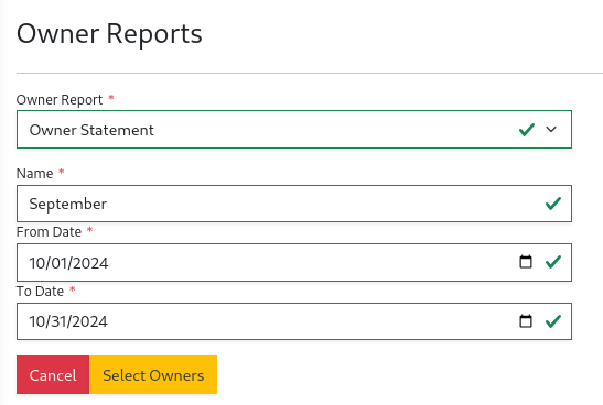 Owner Reportsunder theOwnersmenu. - Select the report type, name, and fill in additional attributes. Select