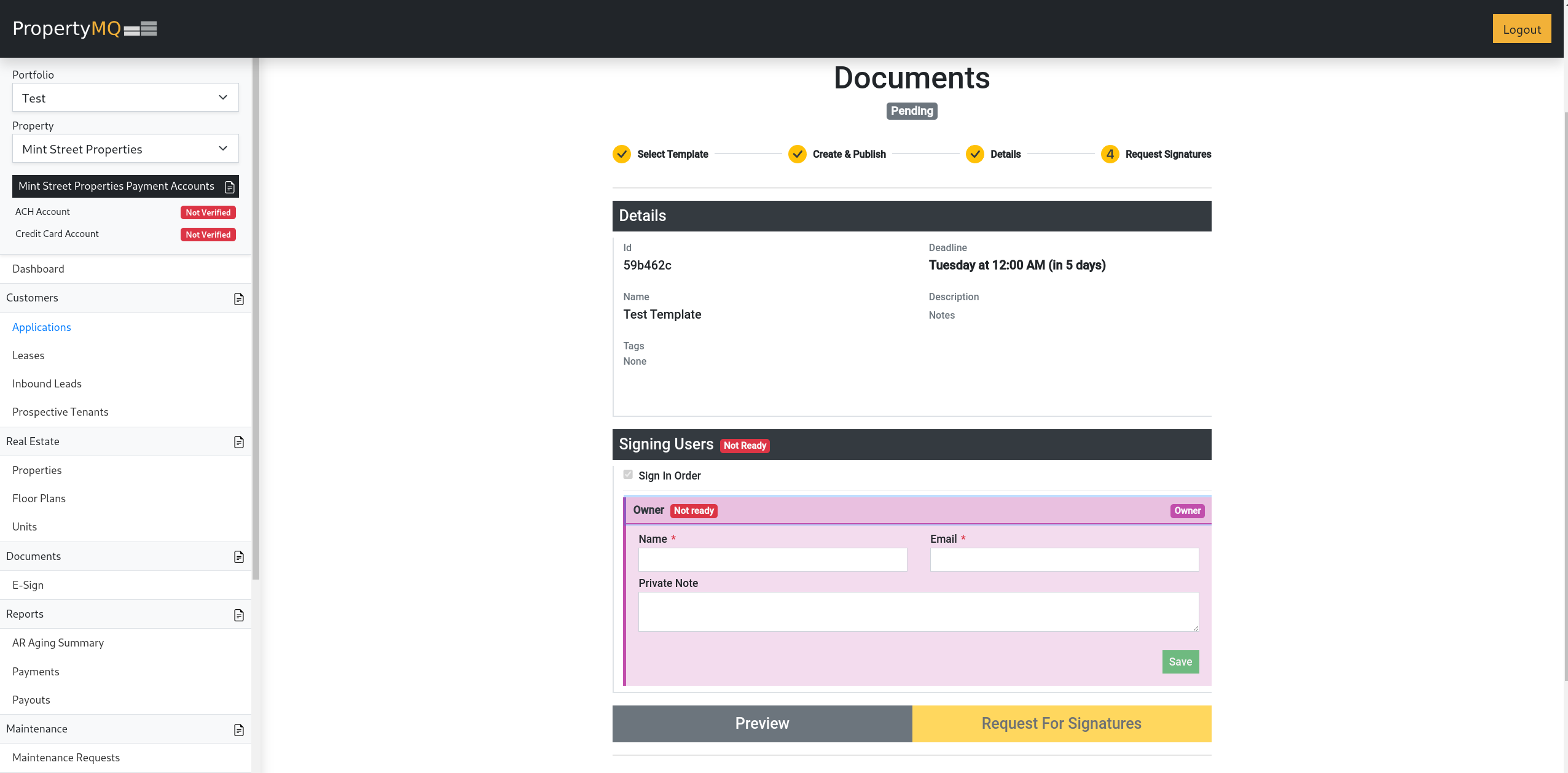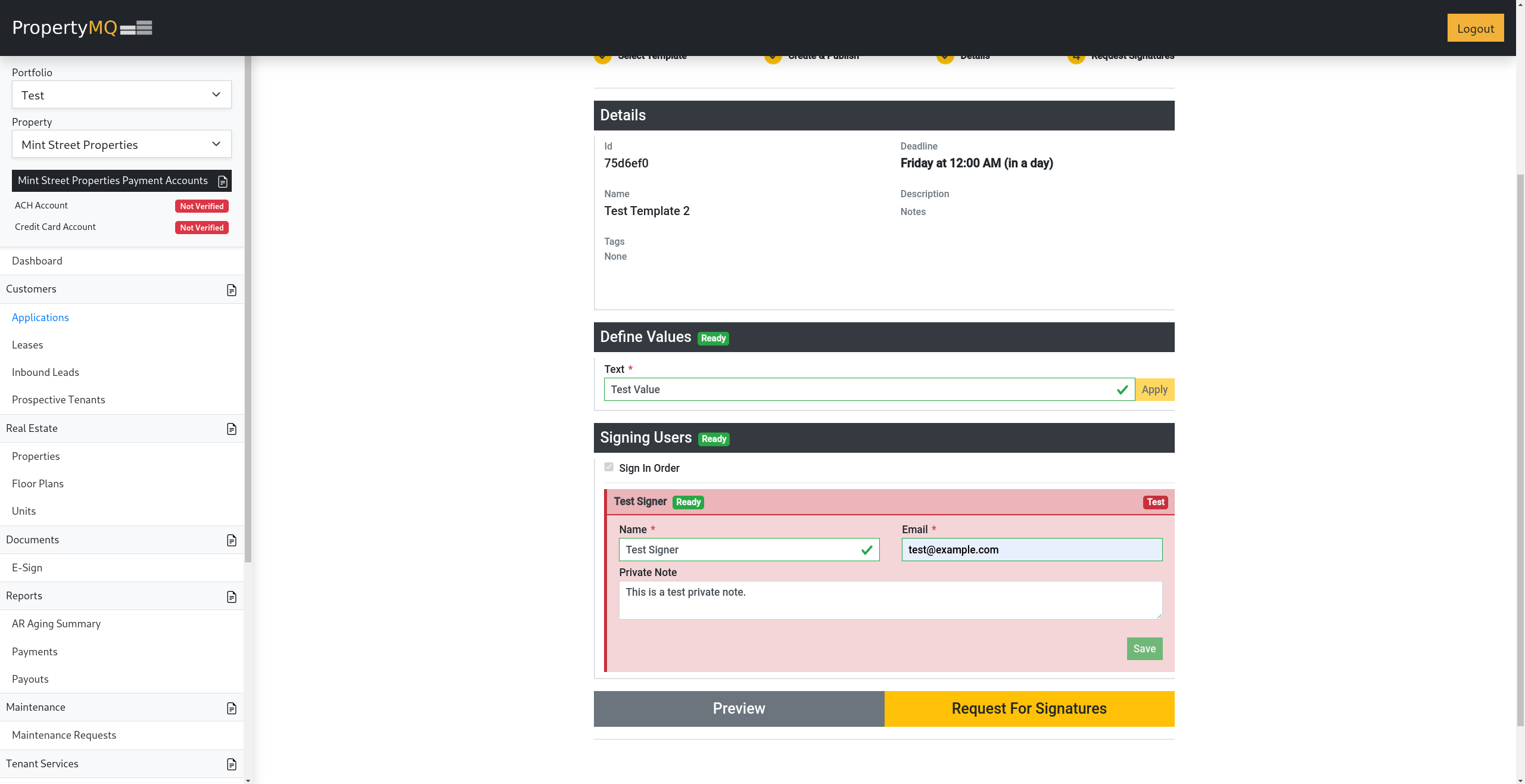 The Request For Signatures button will remain disabled until all sections are marked Ready as shown above. This will happen when all, if any, values in the Define Values section are set and all signing users in the Signing Users section are configured and saved.